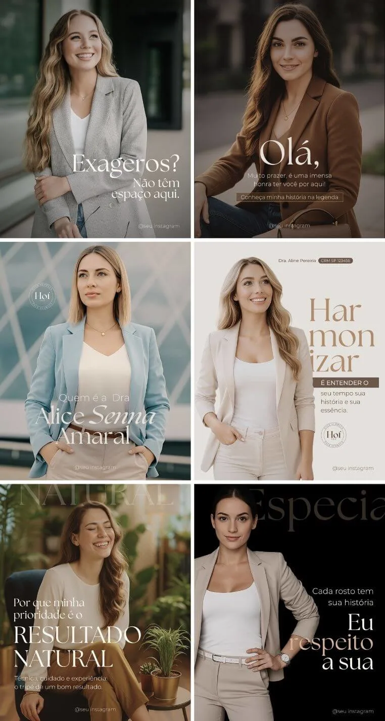 As artes já acompanham legendas pensadas para gerar conexão, despertar desejo e fortalecer sua autoridade com quem realmente importa: suas futuras pacientes.