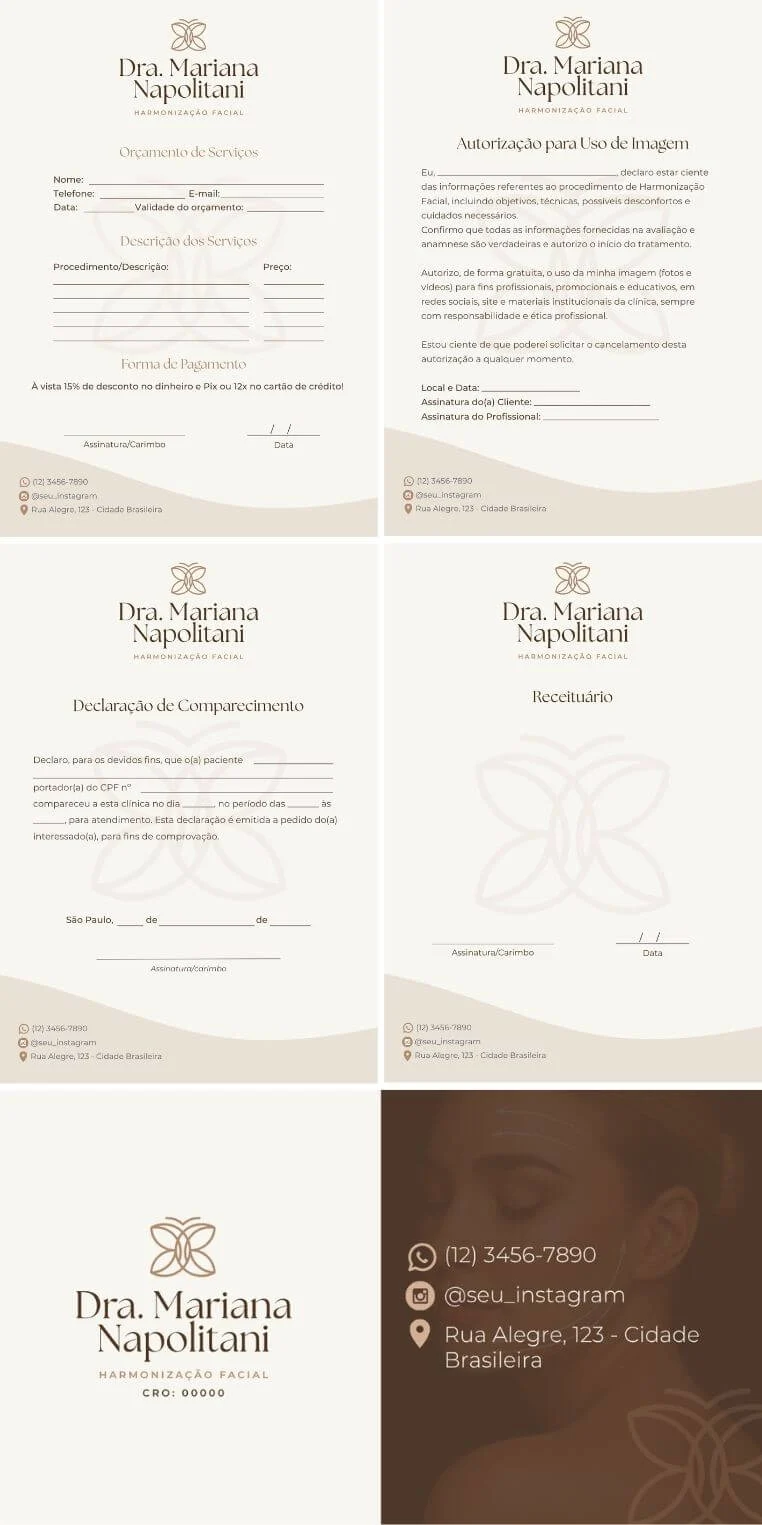 Receba todos os materiais essenciais para sua clínica com identidade profissional: cartão de visitas, papel timbrado, receituário, declaração de comparecimento, ficha de orçamento, pré e pós procedimento e termo de uso de imagem.